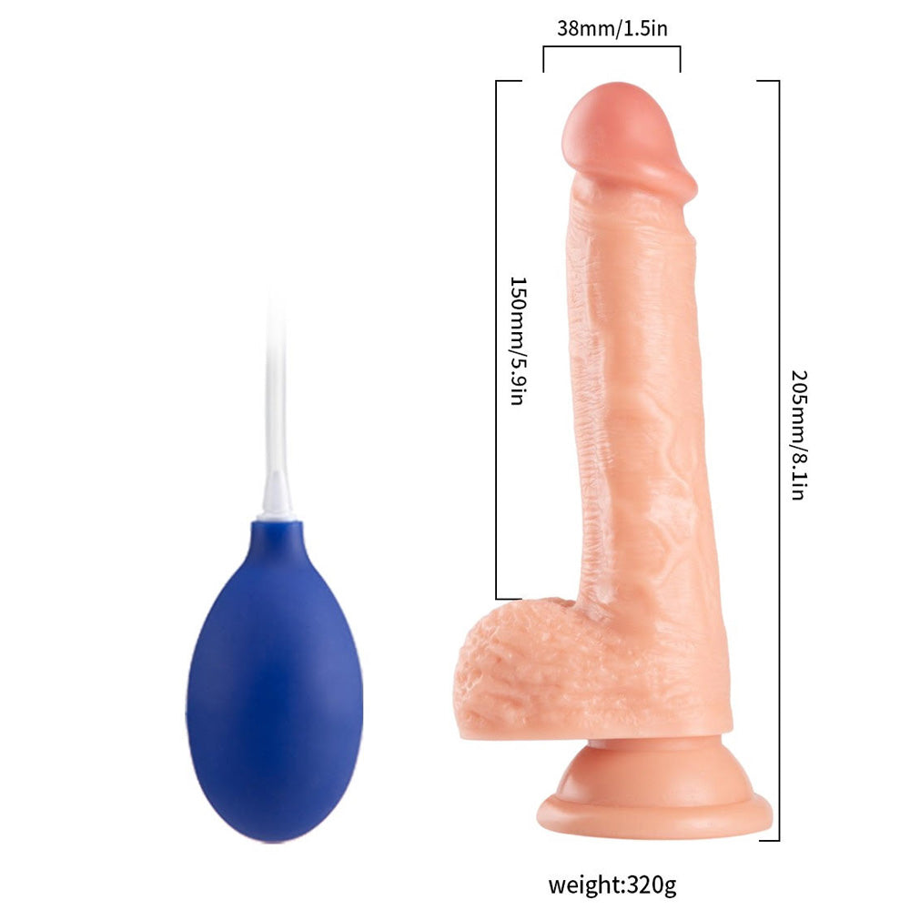 - Squirting, realistic dildo with easy squeeze 'semen' dispenser for ejaculation fantasy play.