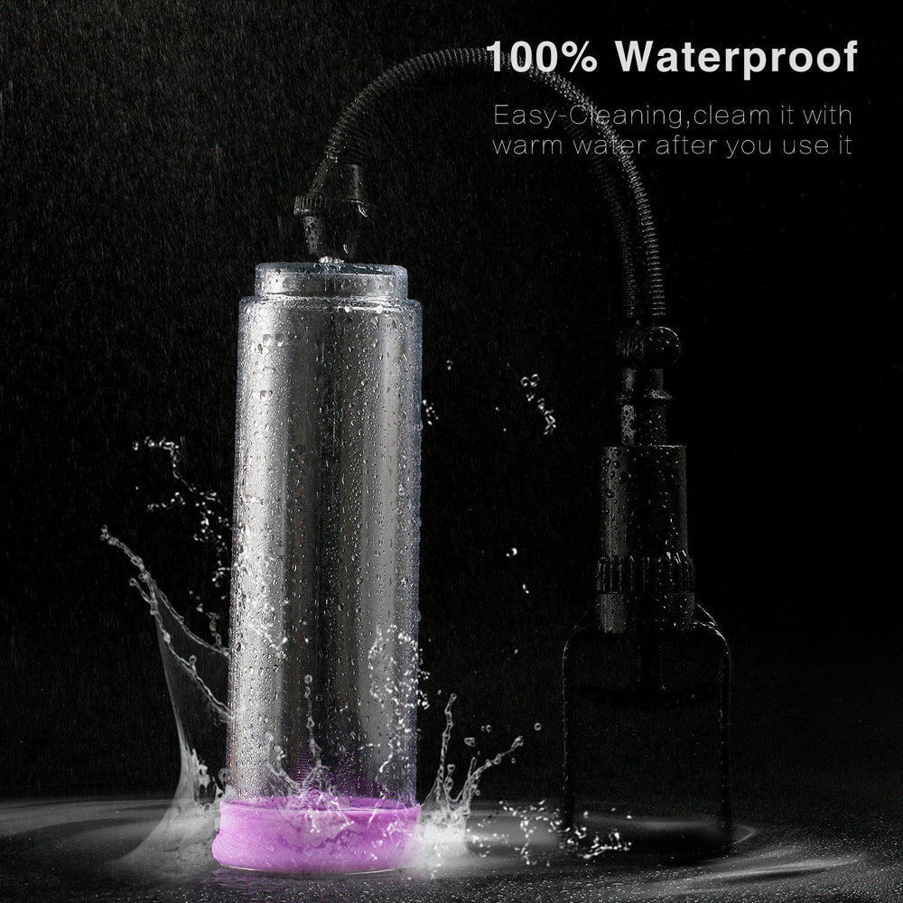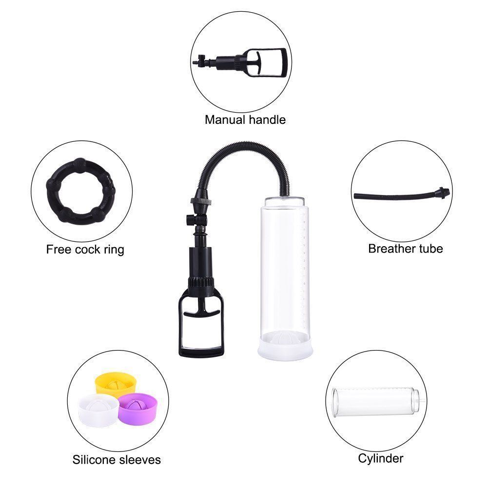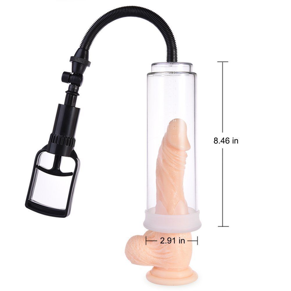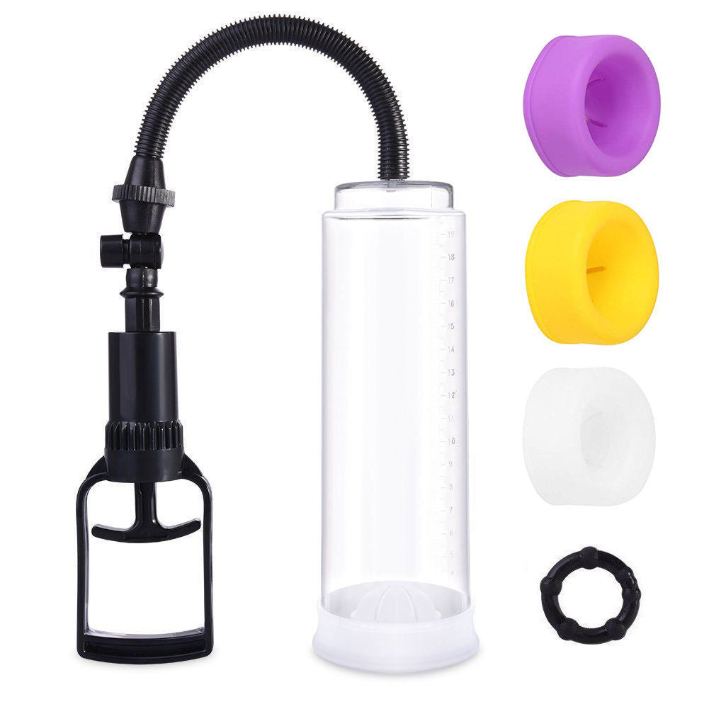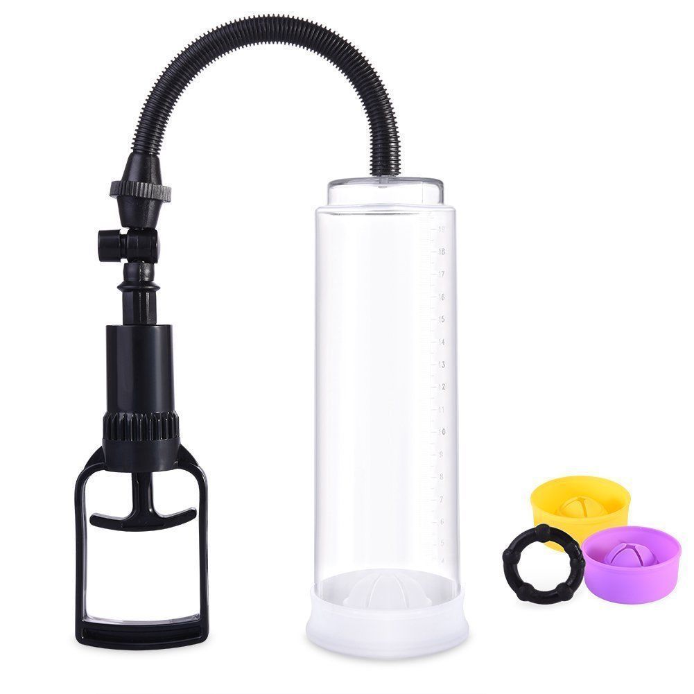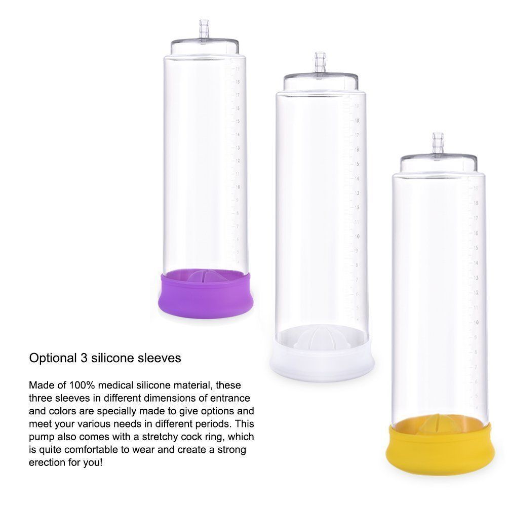 Take what you have and make it bigger with this premium penis pump that's so easy to use, you'll have to stop yourself from using it all the time! Just simply lube up your shaft, slide it in through the soft 2.7" wide silicone sleeve at the base and then use the manual pull handle and watch it grow bigger! Your female or male lover will love the rock solid results and larger penis. Couples may want to add this pump to the foreplay. The three sleeves create an airtight seal for pumping the penis to a strong and full erection. The premium Penis Pump is easy to use, soft jelly opening makes it easy to enter. Extra long vacuum tube allows you to measure your penis growth with each pump! The easy-to-use pumper handle can be used with just one hand! Simply grip in the curve of your hand and pull up with your fingers to start the suction. It comes with a flexible, non-crimp hose with push-button release valve. As soon as you are pumped to full volume, press the release valve and the air will be dispersed safely and easily. The vacuum cylinder is made with clear safety-ensured plastic. It has brilliant length markings on it so you can see just how much your penis has grown!