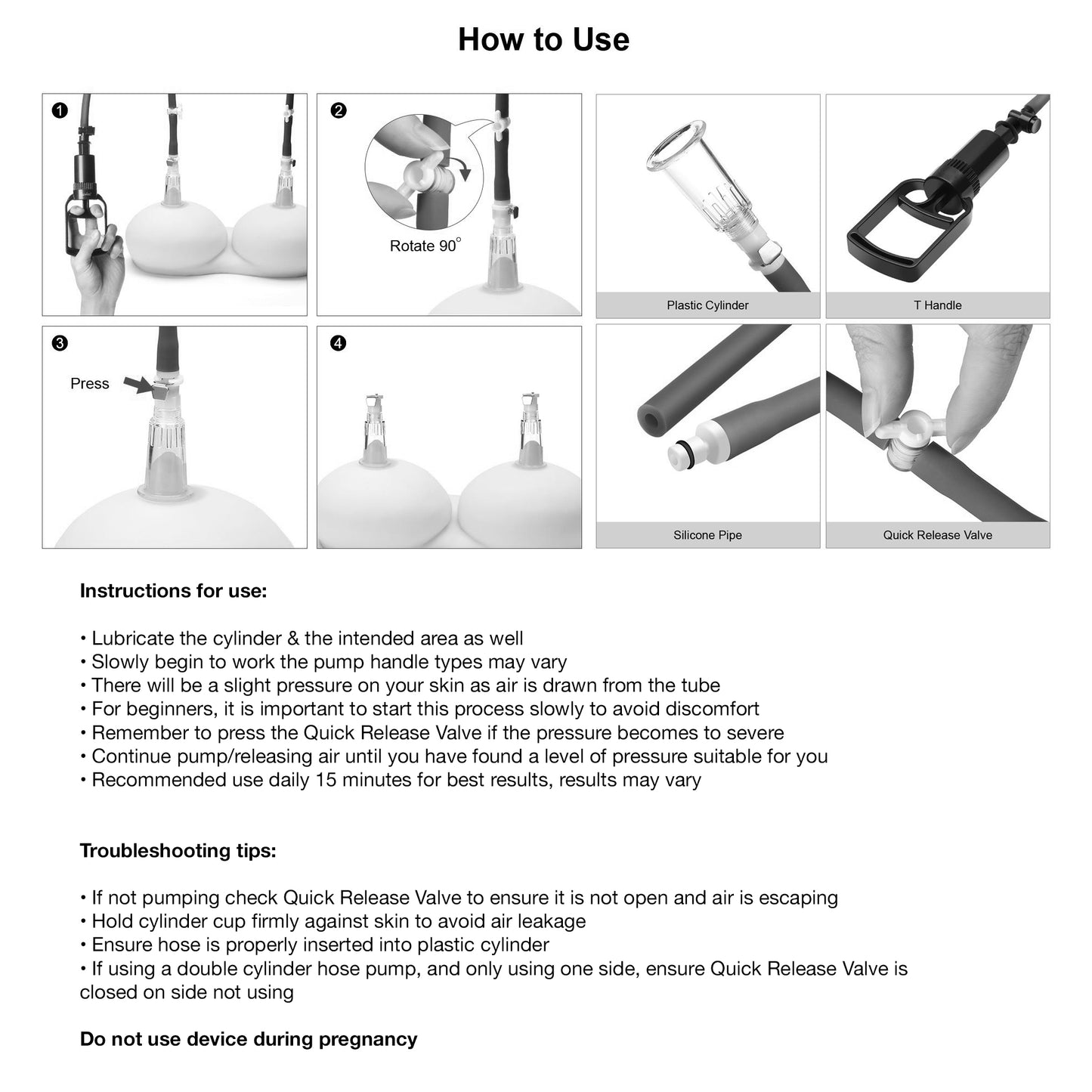 Lubricate the cylinder & the intended area as well. Slowly begin to work the pump. there will be a slight pressure on your skin as air is draw from the tube. For beginners, it is important to star this process slowly to avoid discomfort. Remember to press the safely release valve if the pressure becomes too severe. Continue pumping/releasing air until you've fond a level of pressure suitable you.