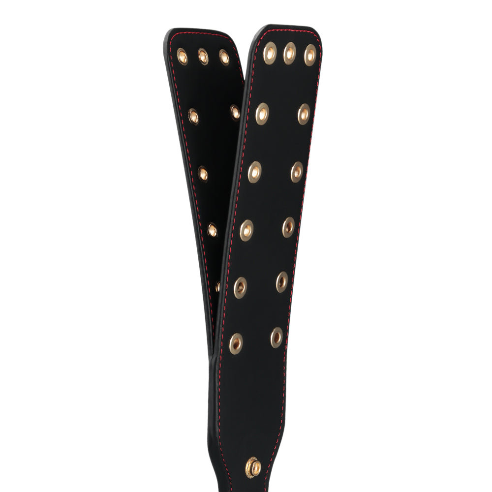 The paddle showcases an intriguing design with two branches, each adorned with hollow rivets. These rivets not only amplify the visual appeal but also enhance the auditory experience. Every swing of this paddle results in an enticing echo, a sound that adds another layer to your intimate encounters.